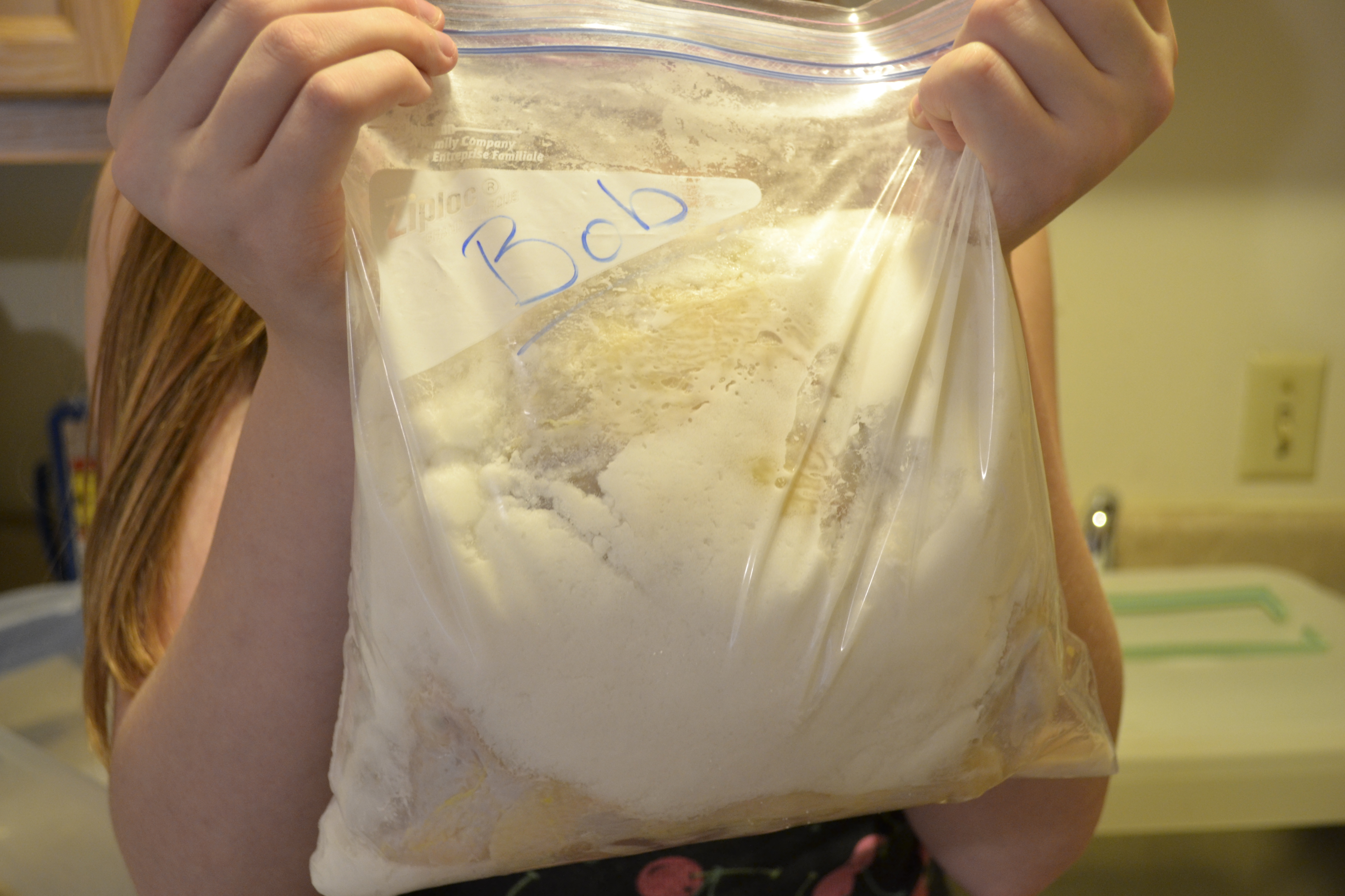 How we managed to wreck a chicken that we had to let “rot” for 6 weeks is beyond me, but we did. I have to say I had no part in it (maybe that was the problem :-)) I have not been getting close as she has been in the kitchen scraping off the old salt mix and putting in the new. So I didn’t notice until yesterday when I dared to get close enough to get some pictures what she was doing. I noticed after the fact and I was looking at the pictures that she has Bob under the faucet, running water on him.